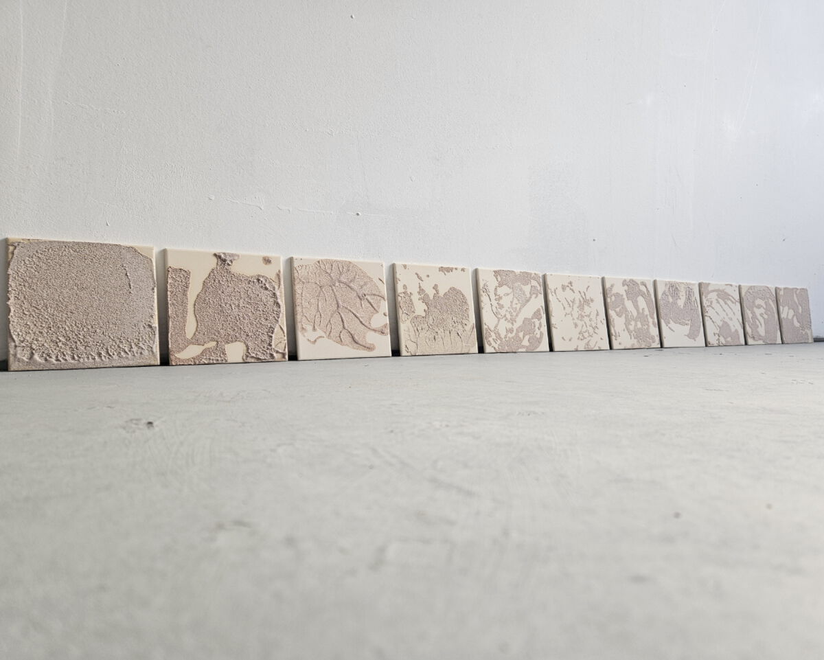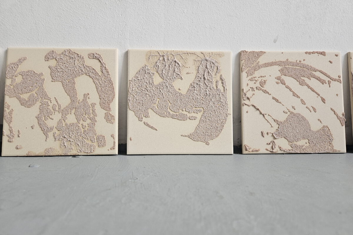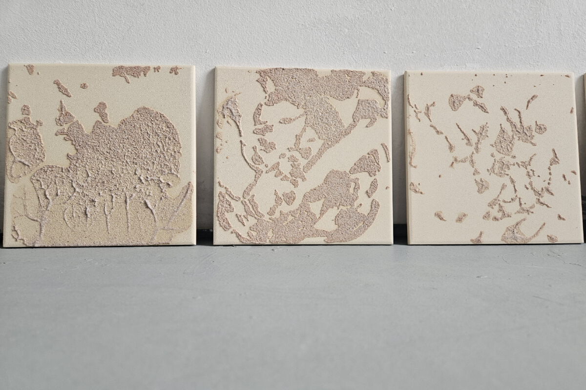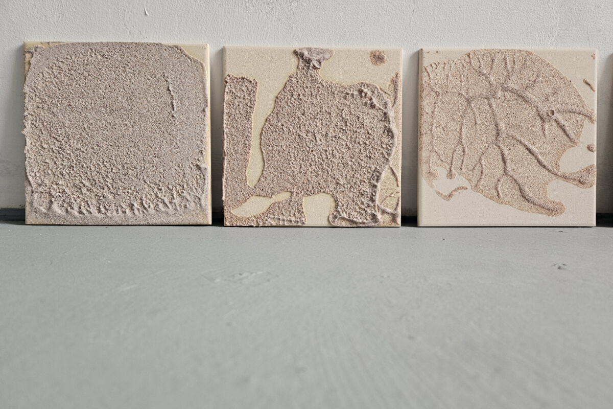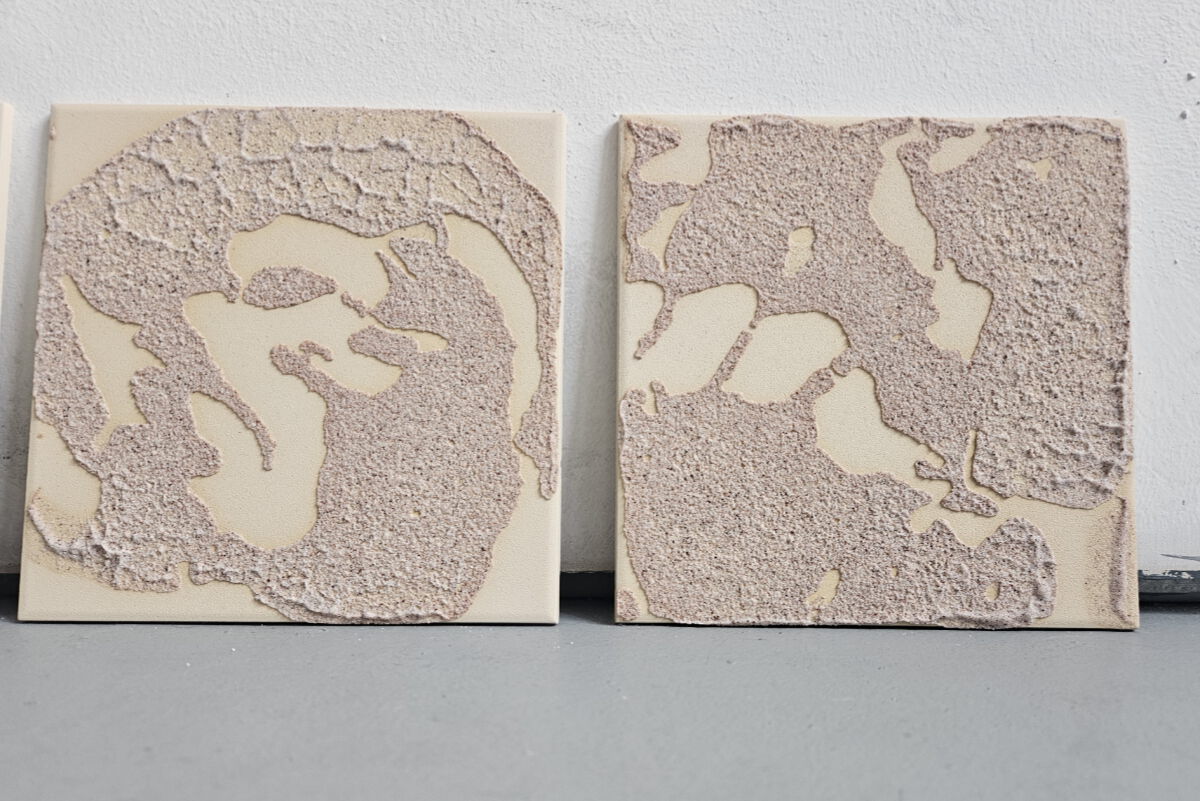 Sand aus Goebbels Garten am Bogensee auf keramische Fliesen gebrannt (jeweils 15 mal 15 cm)