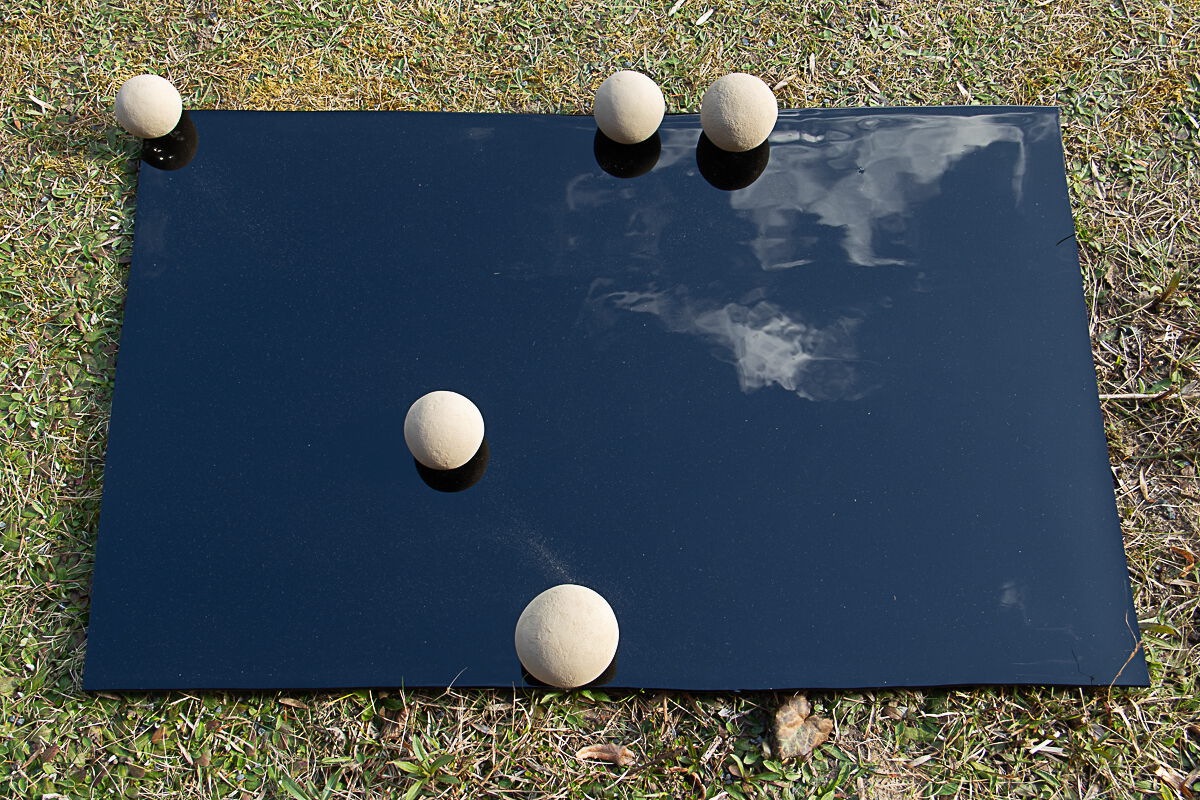 Vier schwarze Glasscheiben liegen flach auf dem Boden. Sie bilden zusammen mit dem Außenaltar den Rahmen und das Terrain der Arbeit. Die schwarzen Scheiben spiegeln Teile des Himmels und der Kirche.