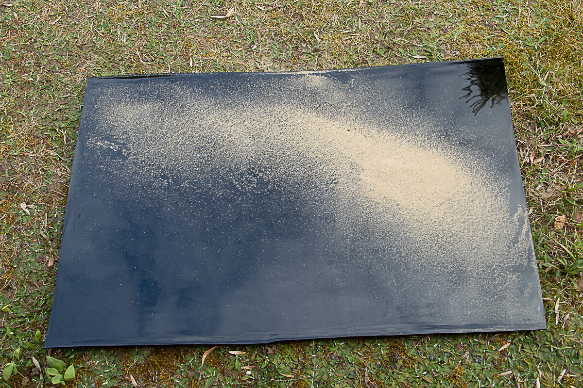 Auf dem Außenaltar und vier schwarzen mundgeblasenen Goethgläsern (Glashütte Lamberts) findet sich sehr fein gesiebter Sand in unterschiedlichen Formen wieder